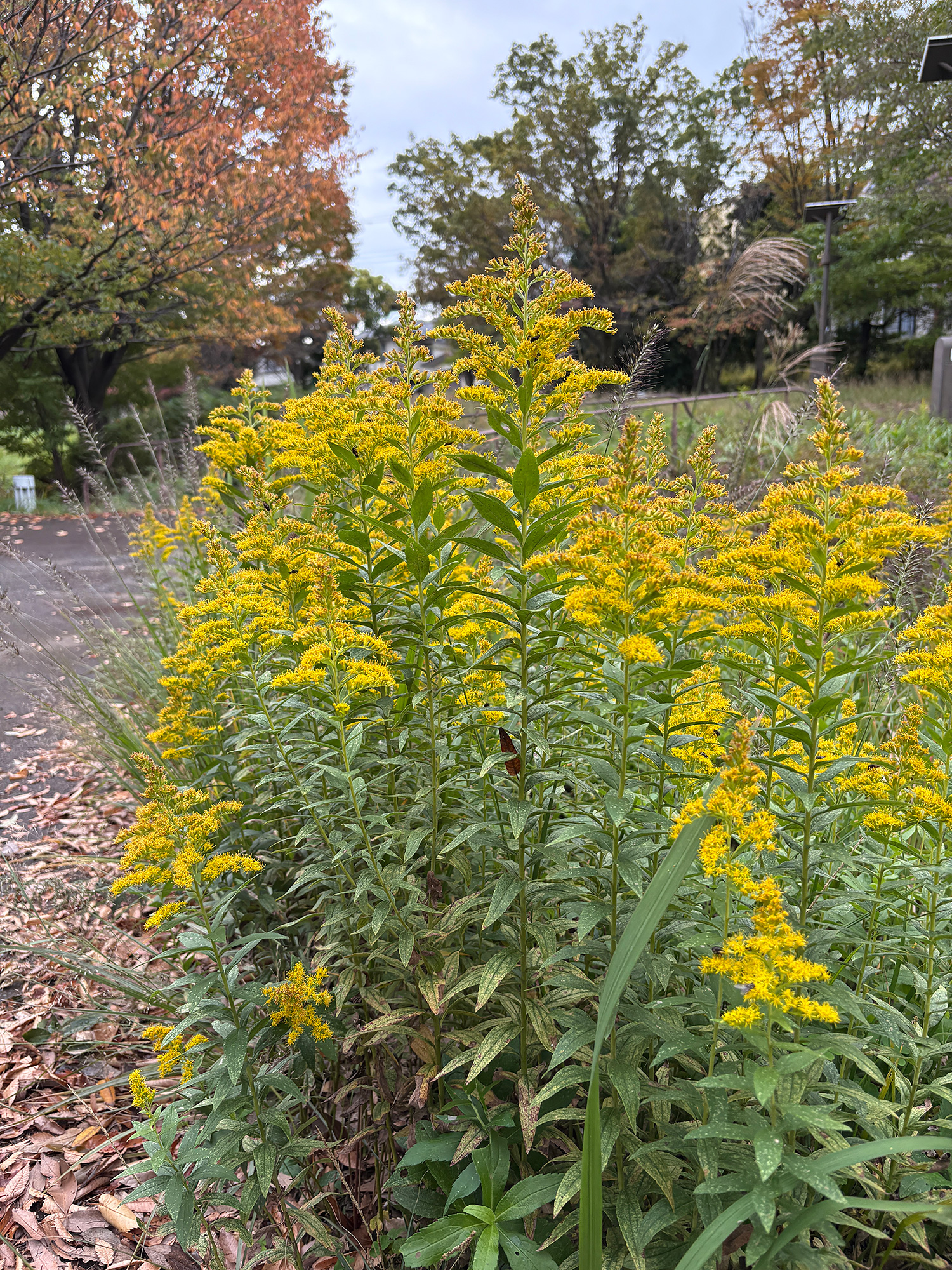 前回も登場したセイタカアワダチソウは、それほど背が高くはなっていませんでしたが、小さな花弁をたくさんつけて、黄色の穂が風に揺れていました。秋の終わりを彩るように咲く姿は、少し寂しげでもあり、力強くもあります。