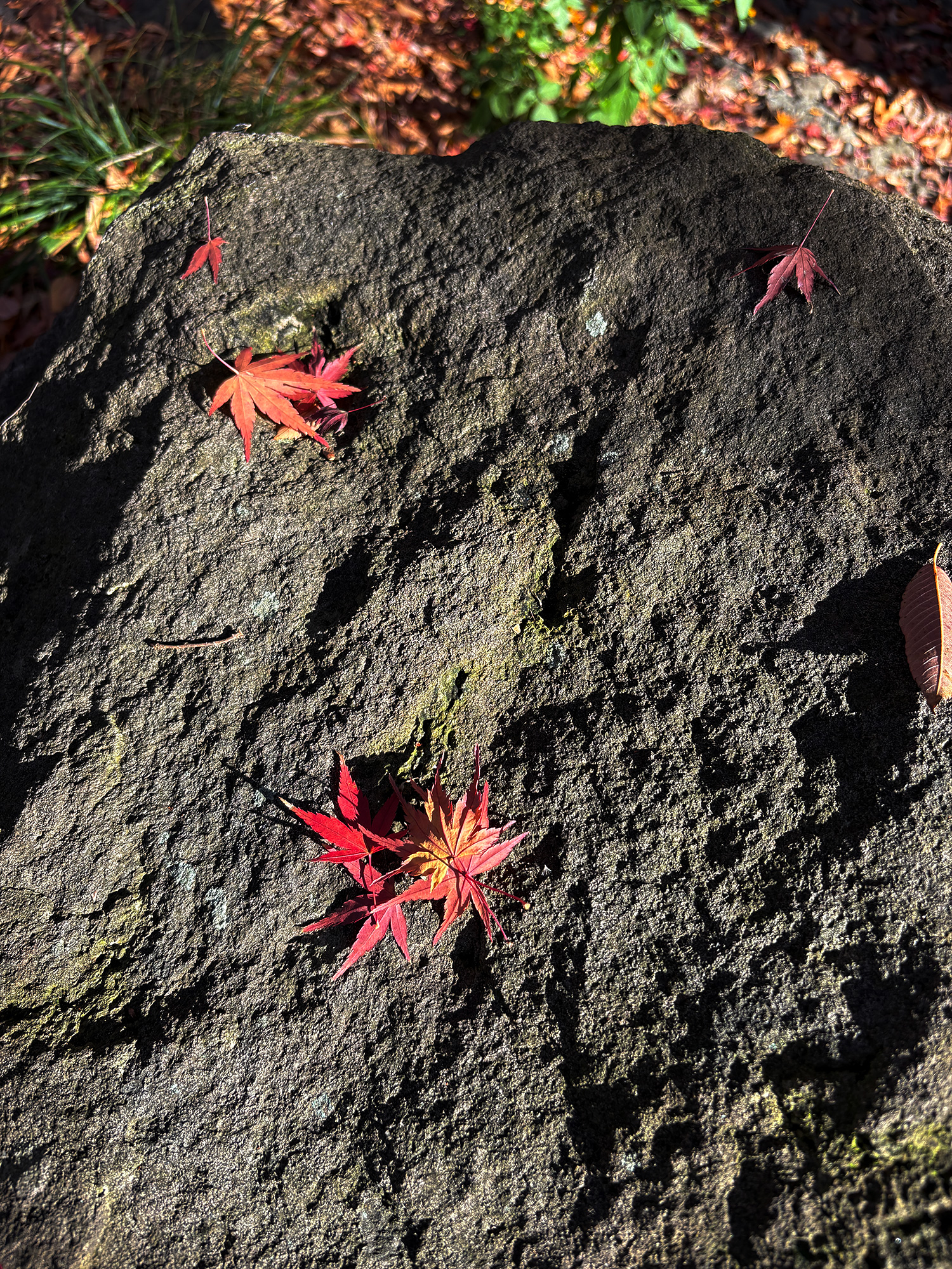 ふと足元を見ると、岩の上に落ちた紅葉がそっと重なっていて、なんだか風情があります。
