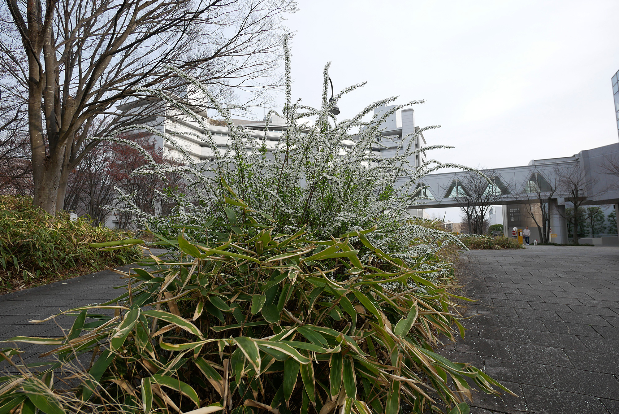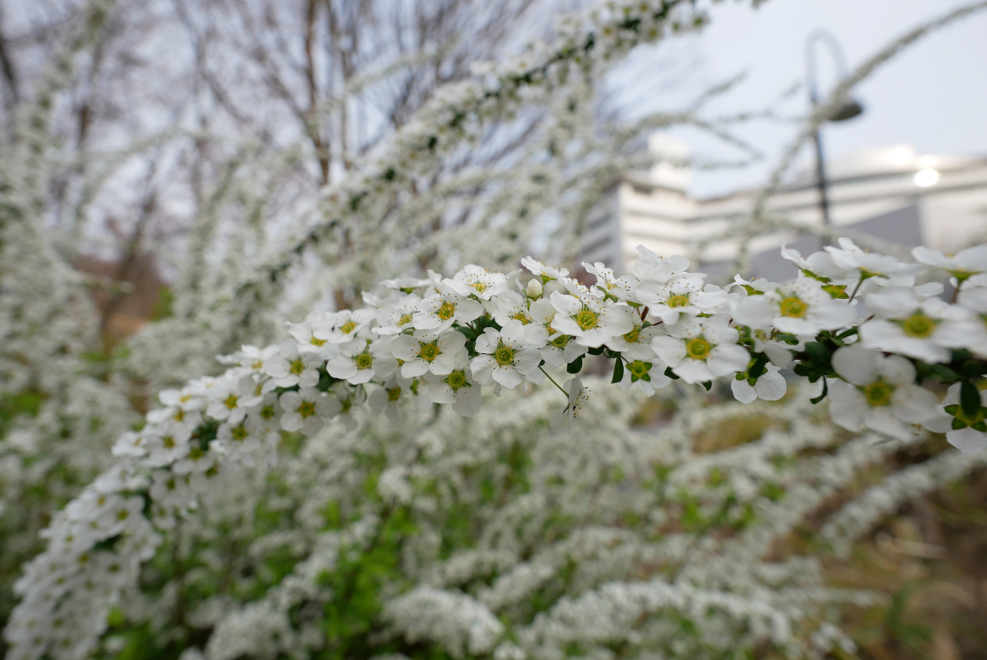 大きなユキヤナギに目を奪われました。細い枝に小さな白い花がびっしりと連なり、大きな株全体が白いしぶきのように広がっています。