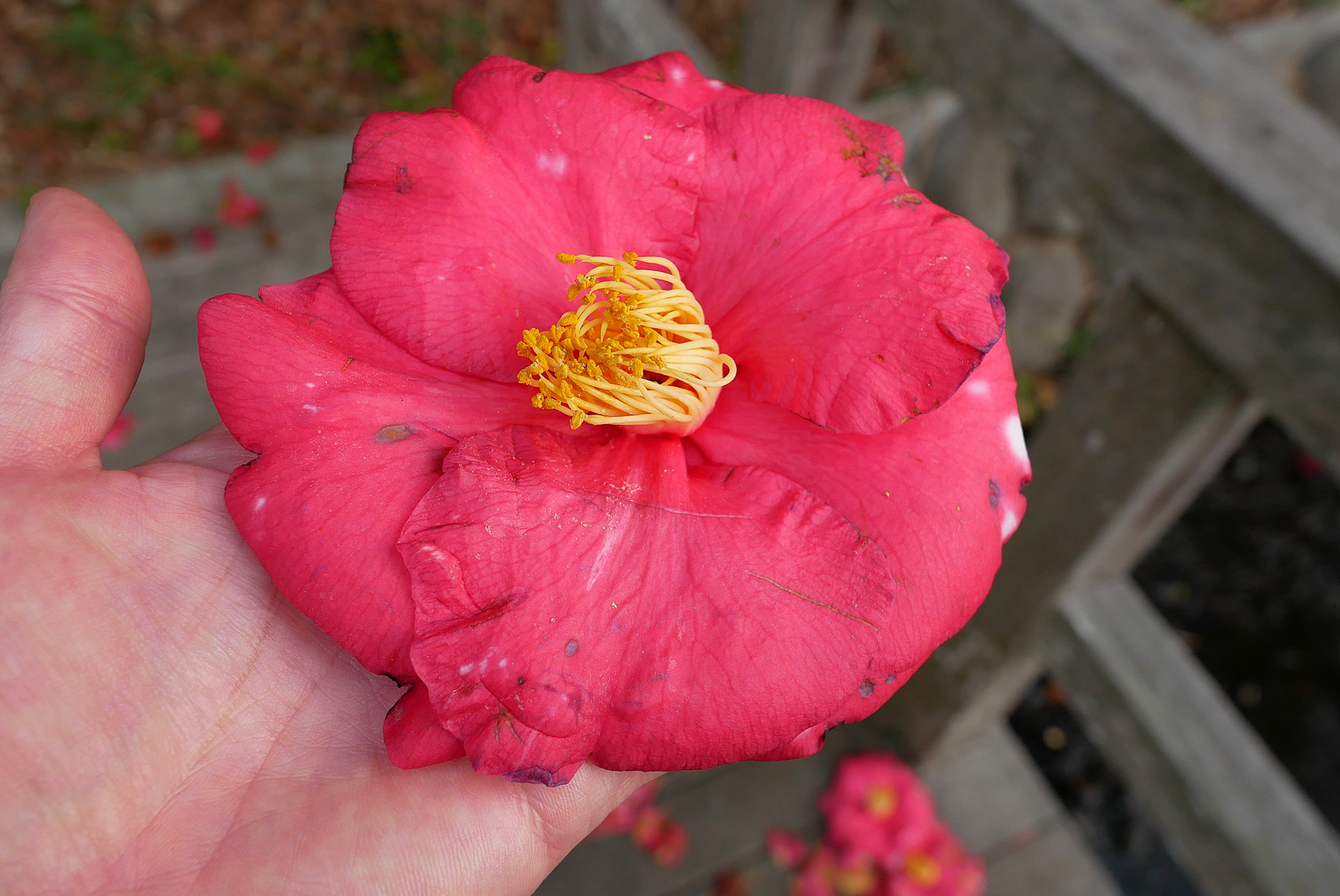 根元に落ちた花を1輪拾ってみると、手のひらにずっしりと重い。椿は花ごとそのまま落ちる——その潔さも、この花の魅力のひとつだと思います。