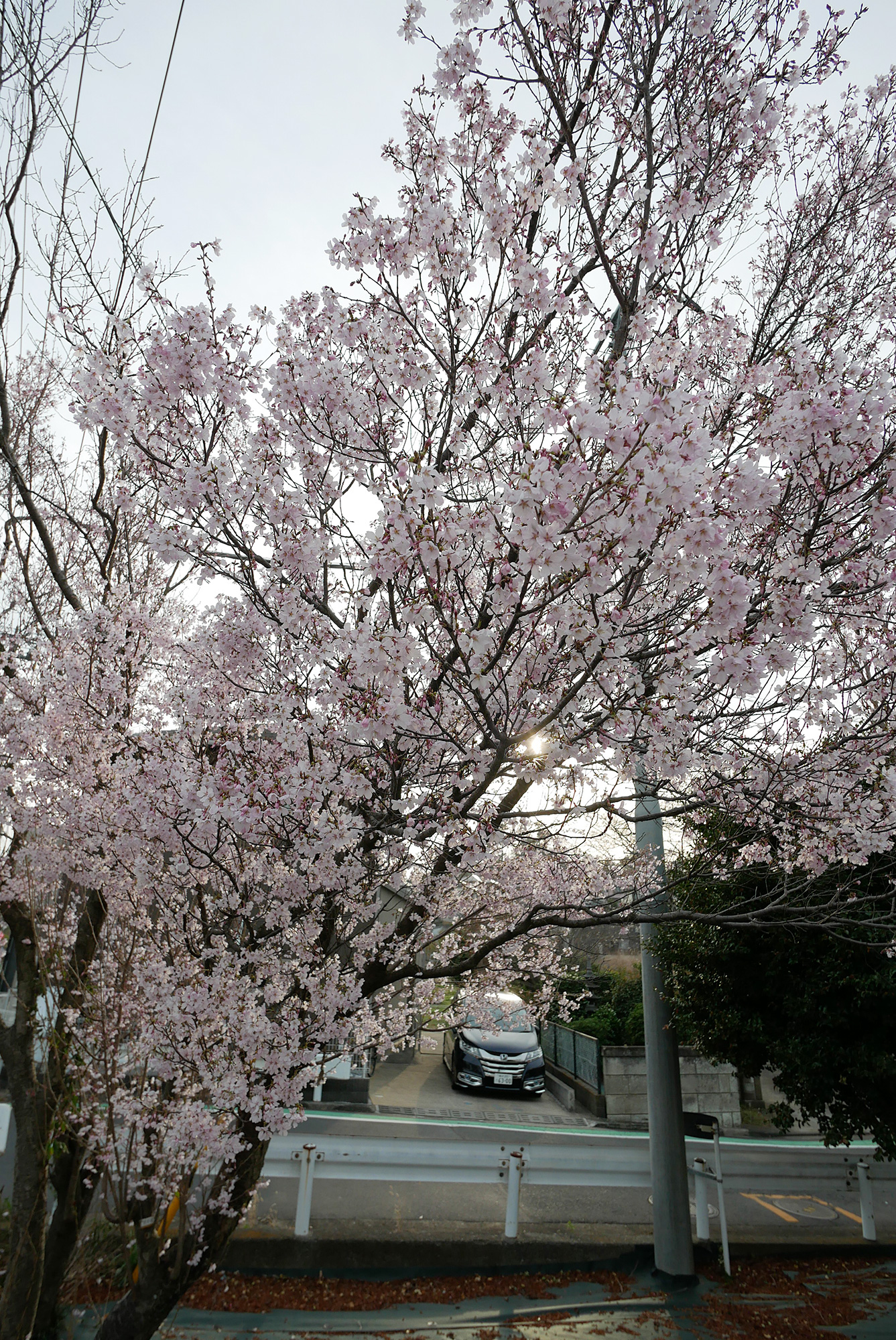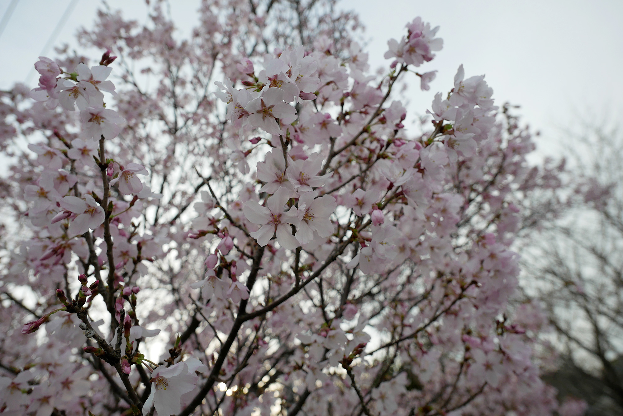 さらに歩くと、ソメイヨシノより一足早く咲く品種の桜が満開になっていました。淡いピンクの花が木全体を包んで、夕暮れの空に映えています。