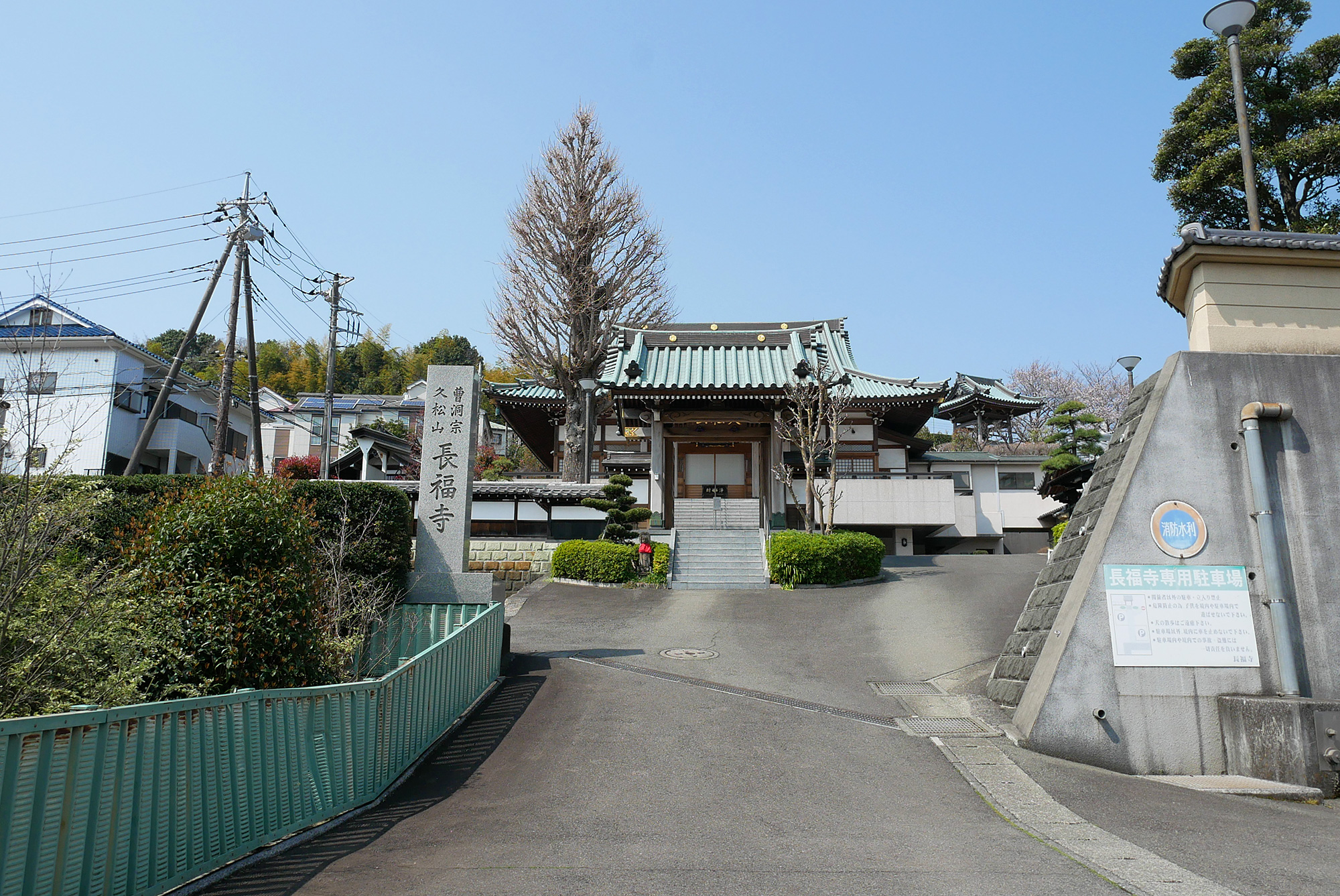 最初のスポット、曹洞宗・長福寺に到着。緑の瓦屋根が印象的なお寺で、境内には熊野社があります。トイレも完備されています。