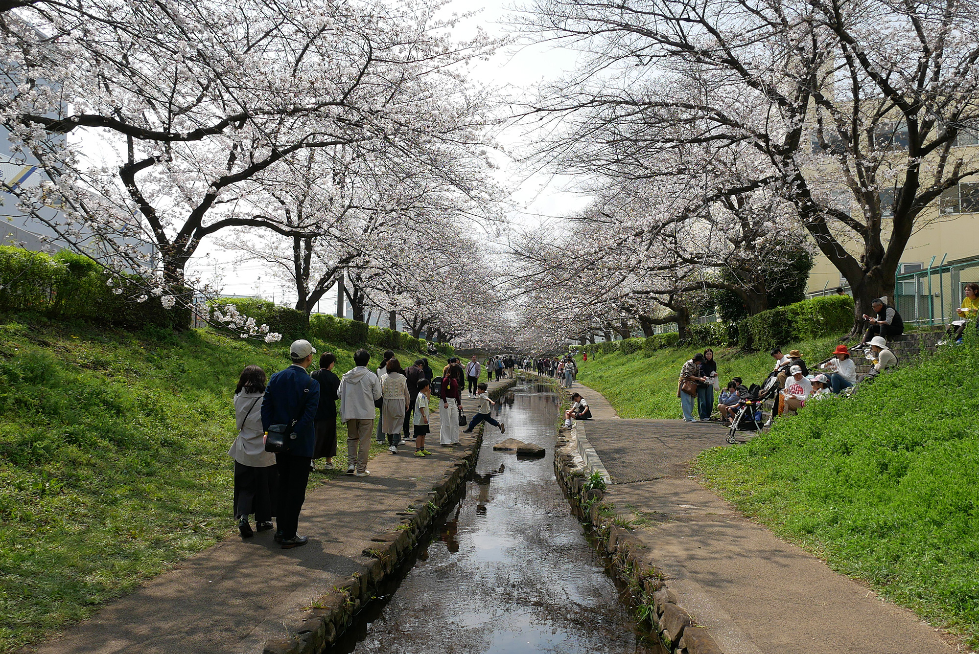 コースの最後は江川せせらぎ緑道です。桜はまだ5分咲きといったところでしたが、小川沿いの遊歩道は大勢の人で賑わっていました。