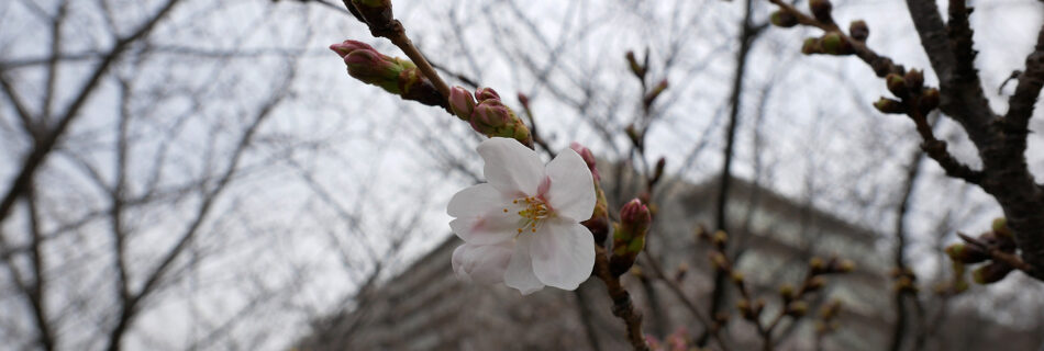 3月22日の夕方、都筑緑道を歩いてきました。最高気温は16℃ほど。昼間は暖かかったのに、日が傾くとひんやりと肌寒い、そんな春の一日です。 都筑小学校前の桜並木はまだ1分咲きにも満たない様子。1輪だけ開いた花を見つけてクロ …
